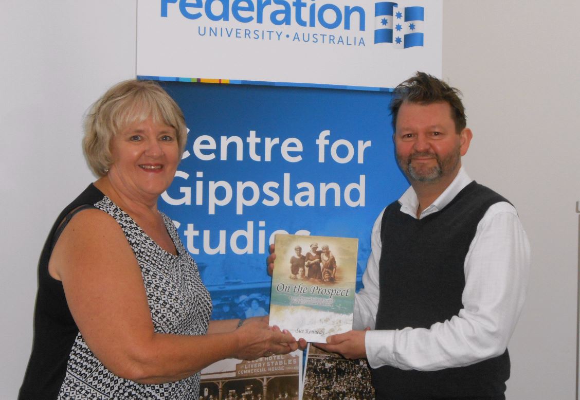 The Centre for Gippsland Studies is a Library / Archive and Research Centre, established in 1985.  It holds published works, manuscript material, Journals, photographs, maps and more.  Many are the only copies held in Gippsland.  It also holds extensive unique material for the former township of Yallourn.  [Photo: Author Sue Kennedy, recently donating a copy of her latest book, On the prospect: a comprehensive historical timeline of the district known as Seaspray, to Professor Erik Eklund, Director of the Centre for Gippsland Studies]