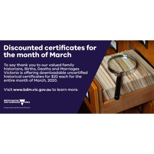 To say thank you to our valued family historians, the Registry of Births, Deaths and Marriages Victoria (BDM Victoria) are offering downloadable uncertified historical certificates for $20 each for the entire month of March.