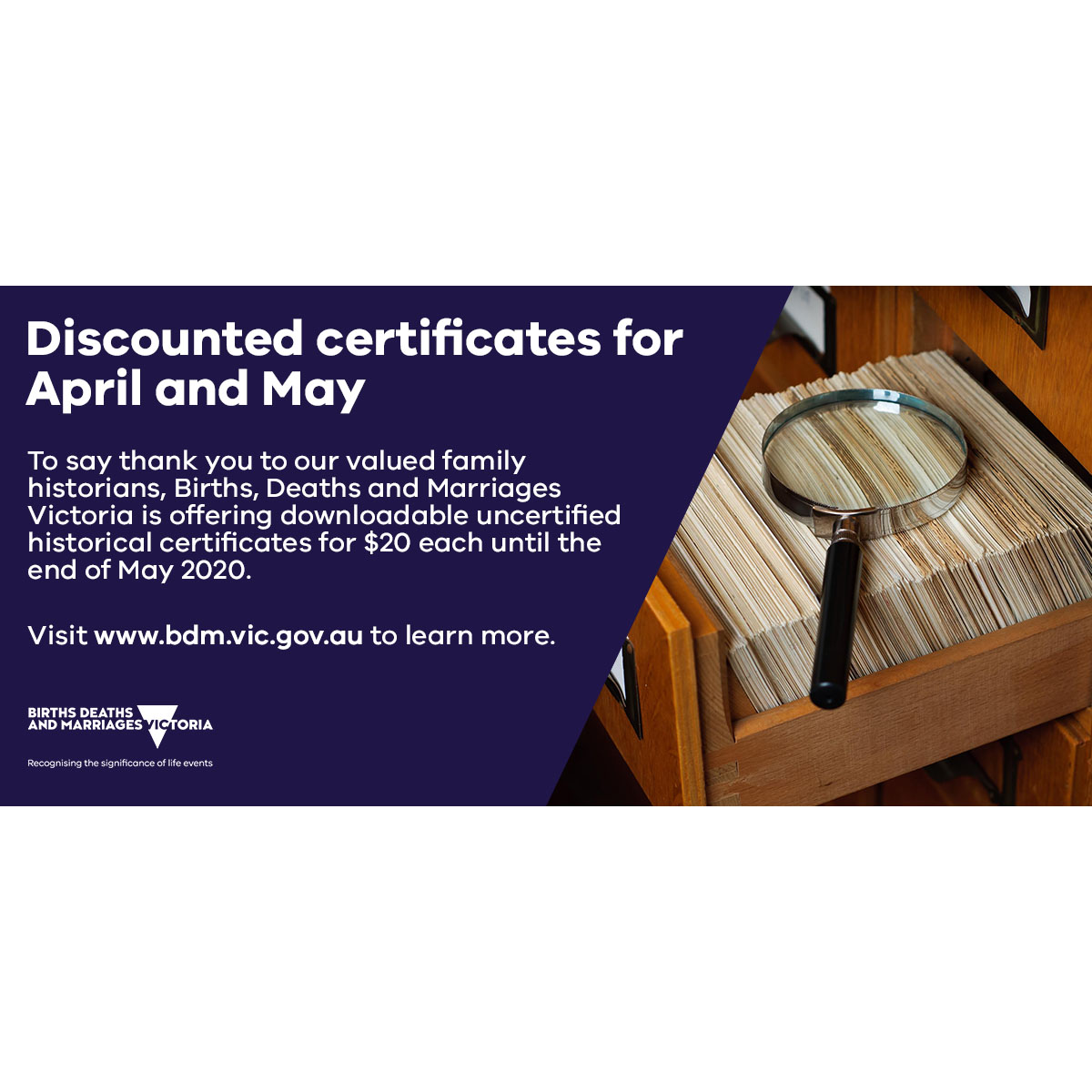 To say thank you to our valued family historians, Births, Deaths and Marriages Victoria is offering downloadable uncertified historical Certificates for $20 each until the end of May 2020.